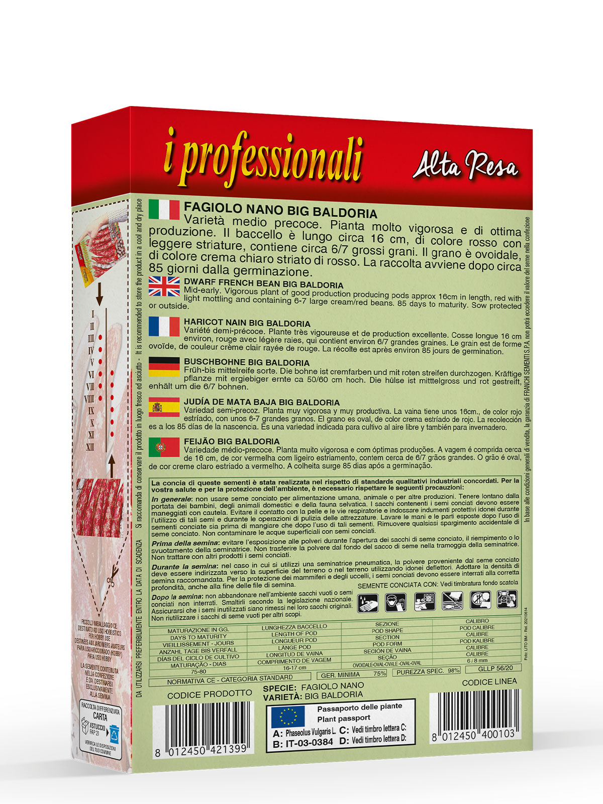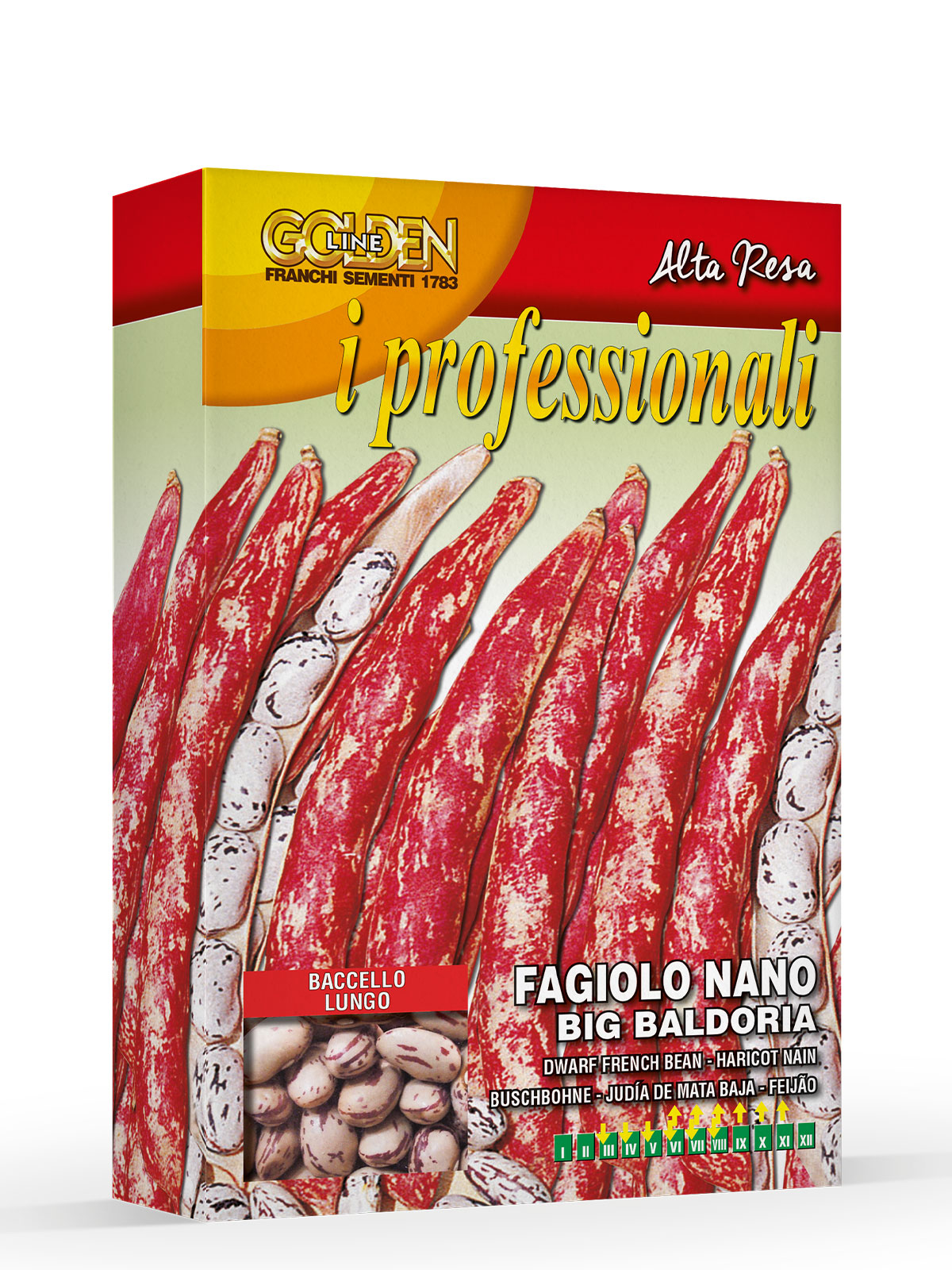FAGIOLO NANO BIG BALDORIA – Varietà medio precoce. Pianta molto vigorosa e di ottima produzione. Il baccello è lungo circa 16 cm, di colore rosso con leggere striature, contiene circa 6/7 grossi grani. Il grano è ovoidale, di colore crema chiaro striato di rosso. La raccolta avviene dopo circa 85 giorni dalla germinazione.
