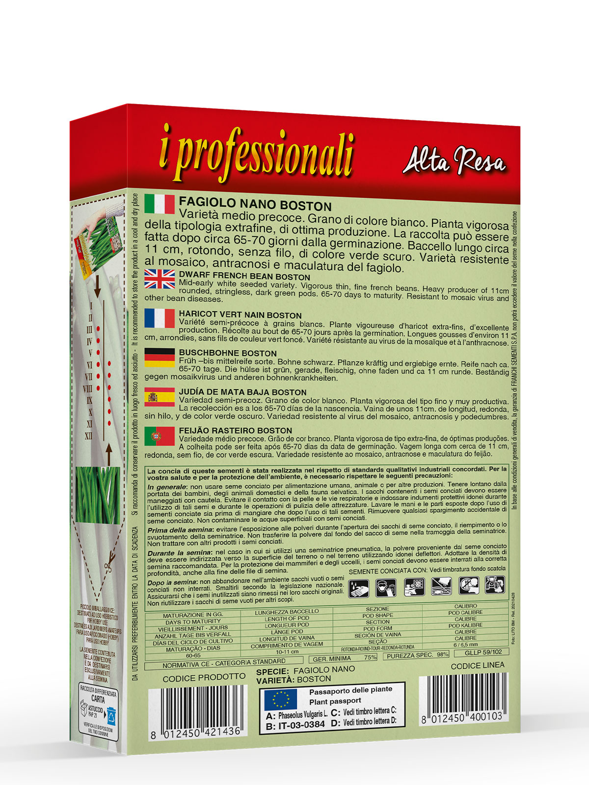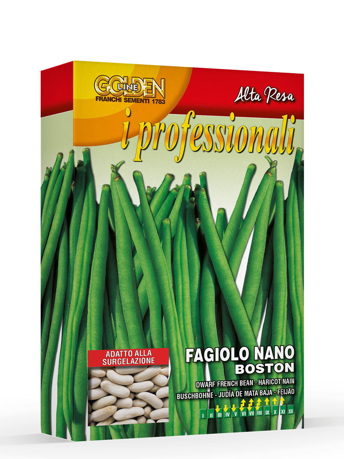 FAGIOLO NANO BOSTON – Varietà medio precoce. Grano di colore bianco. Pianta vigorosa della tipologia extrafine, di ottima produzione. La raccolta può essere fatta dopo circa 65-70 giorni dalla germinazione. Baccello lungo circa 11 cm, rotondo, senza filo, di colore verde scuro. Varietà resistente al mosaico, antracnosi e maculatura del fagiolo.