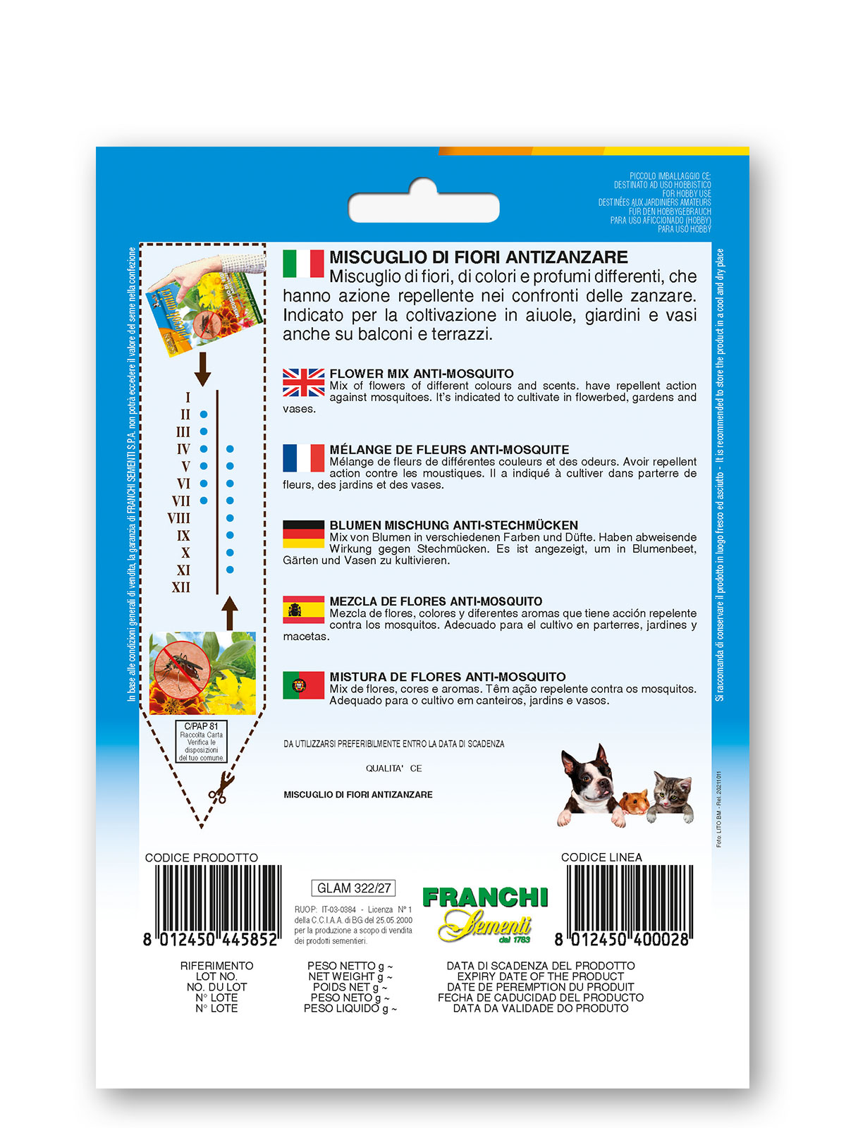 Miscuglio di fiori, di colori e profumi differenti, che hanno azione repellente nei confronti delle zanzare. Indicato per la coltivazione in aiuole, giardini e vasi anche su balconi e terrazzi.