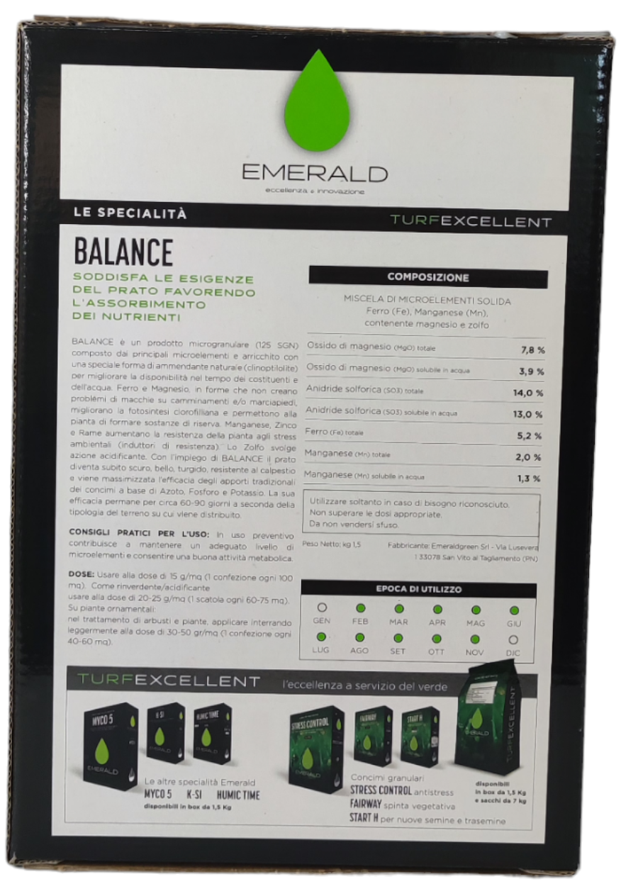 BALANCE è un prodotto microgranulare (125 SGN) composto dalla catena dei principali microelementi e arricchito con una speciale forma di ammendante naturale (clinoptilolite) per migliorare la disponibilità nel tempo dei costituenti e dell’acqua.