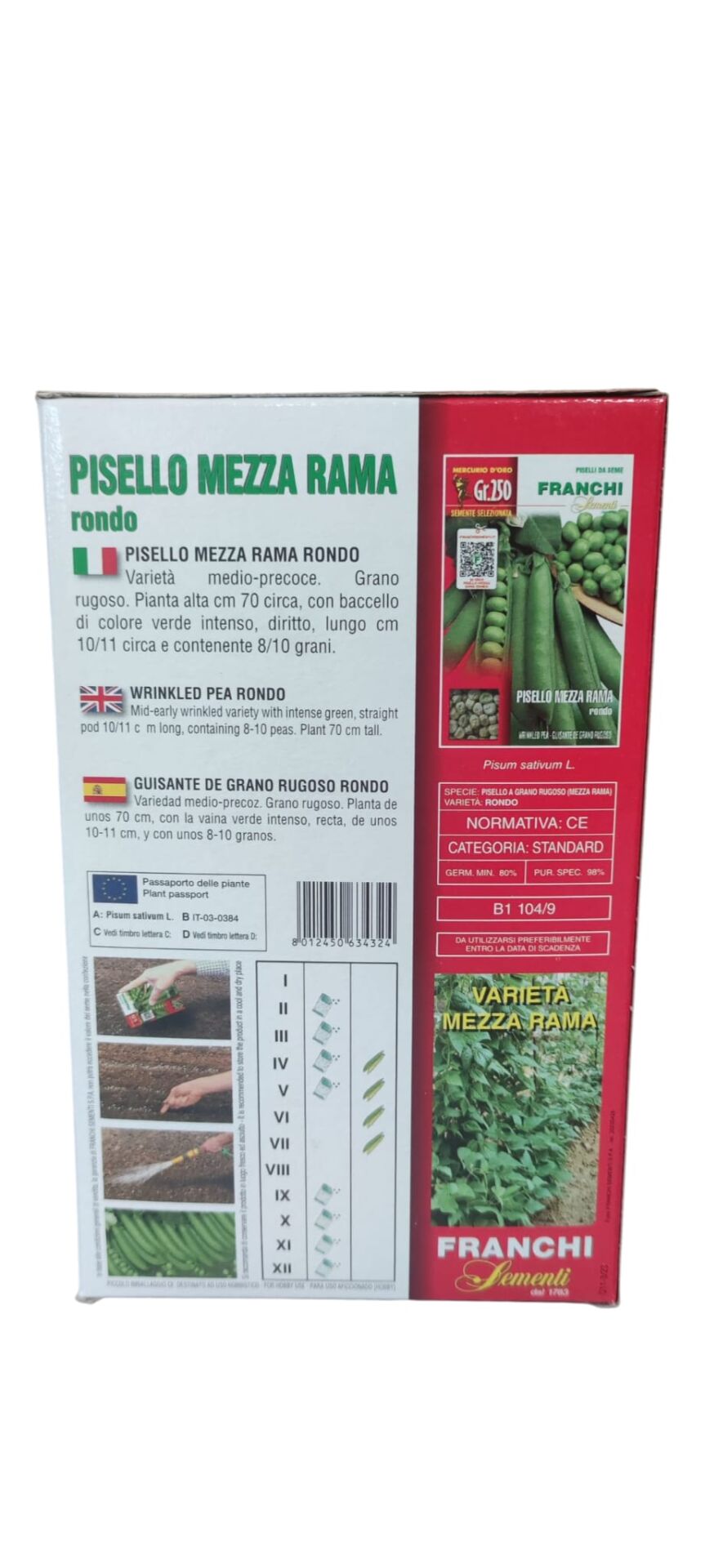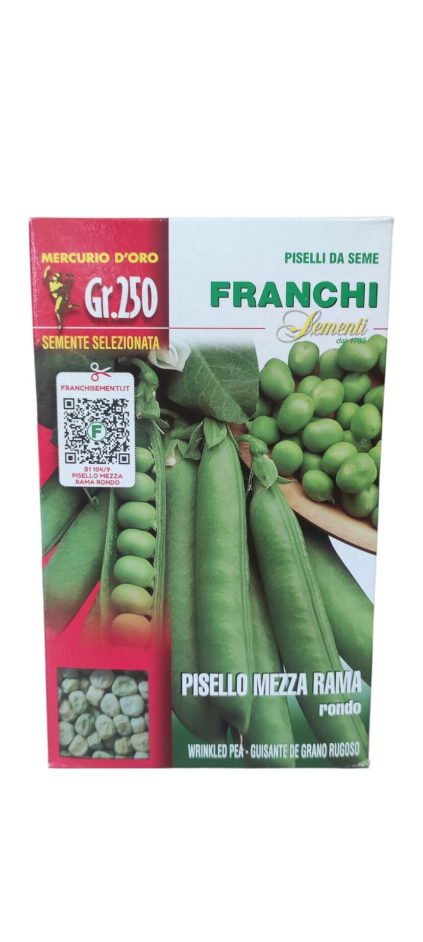 PISELLO MEZZA RAMA RONDO – Varietà medio-precoce a grano rugoso. Pianta alta 70 cm. con baccello verde, diritto, lungo 10/11 cm., 8/10 grani.